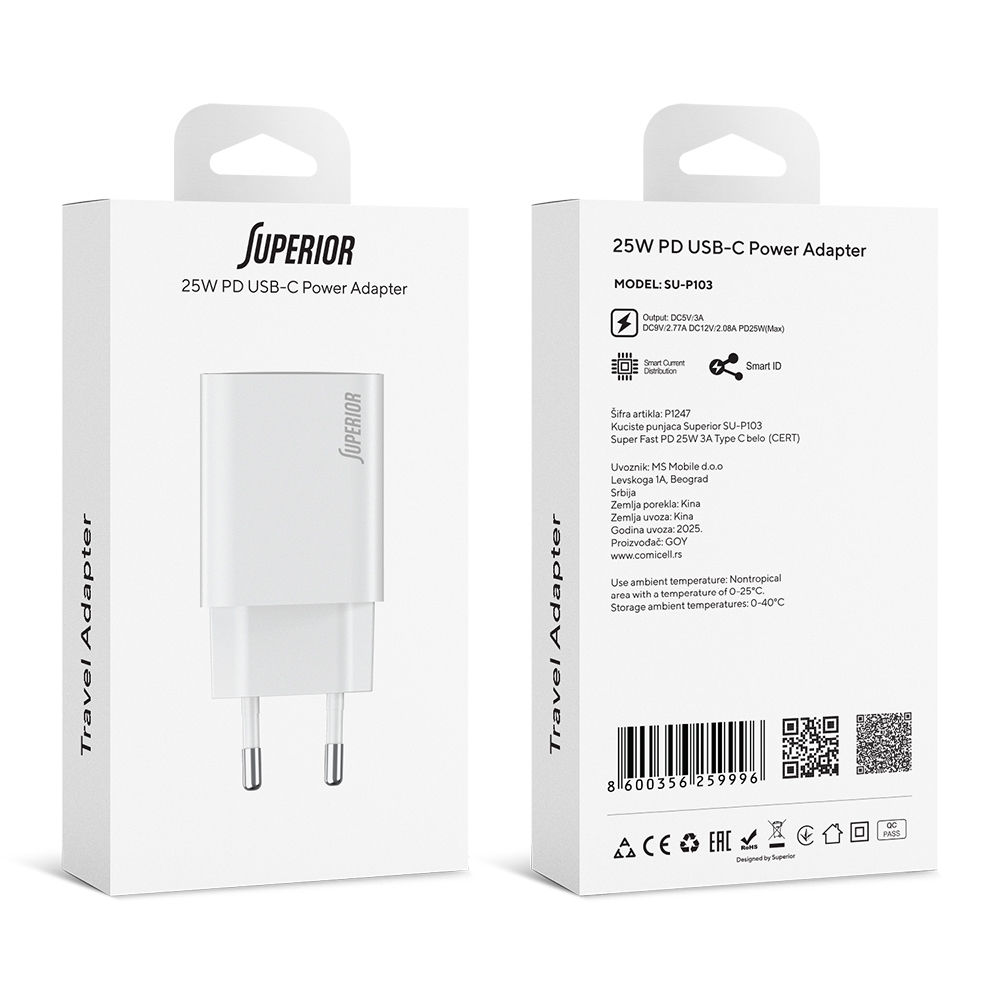 Kuciste punjaca Superior SU-P103 Super Fast PD 25W 3A Type C belo (CERT)
