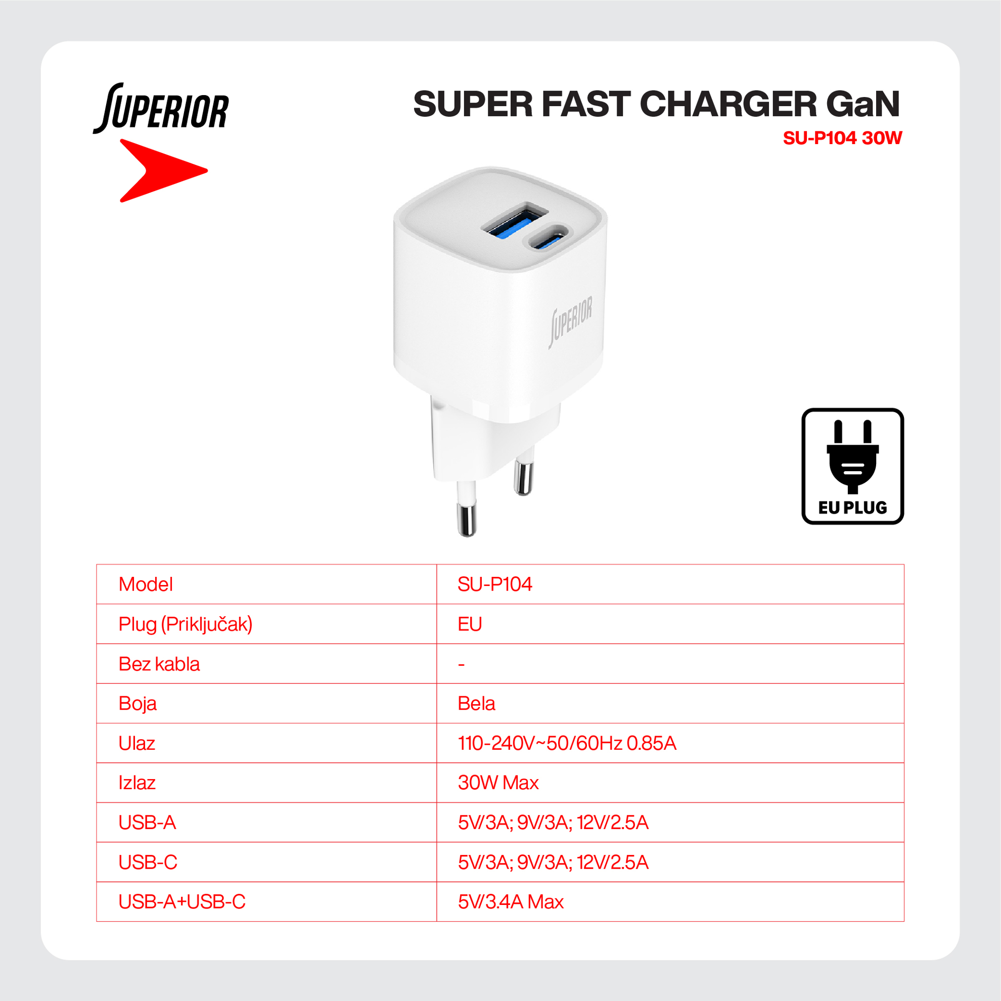 Kuciste punjaca Superior SU-P104 30W GaN Super Fast USB A QC3.0+Type C belo