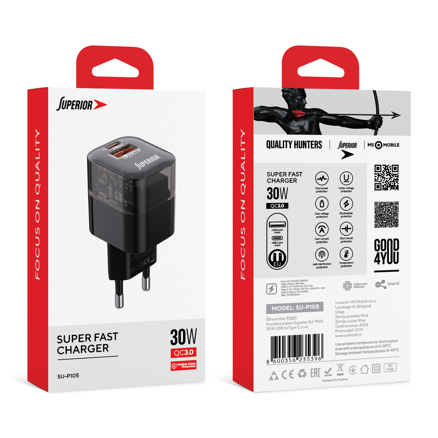 Kuciste punjaca Superior SU-P105 30W Super Fast USB A QC3.0+Type C crno