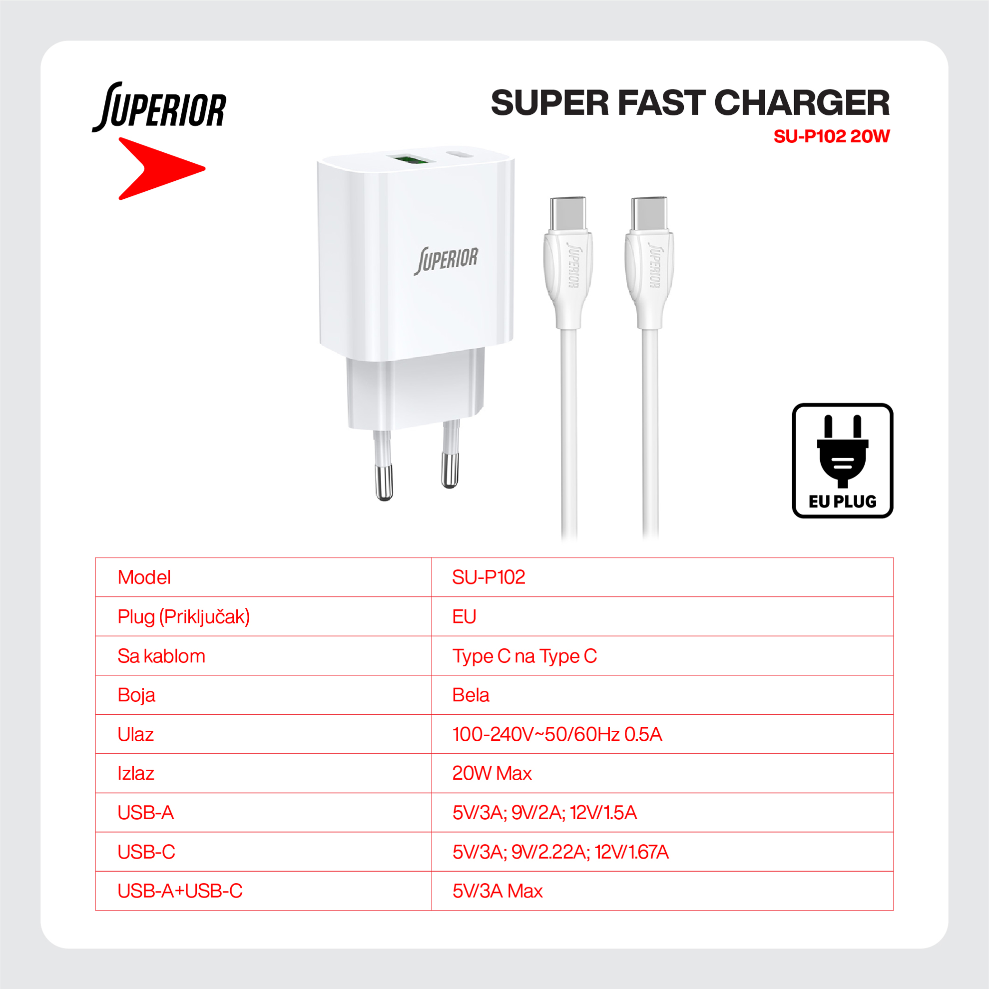 Kucni punjac Superior SU-P102 20W Super Fast USB A QC3.0+Type C sa Type C na Type C kablom beli (CERT)