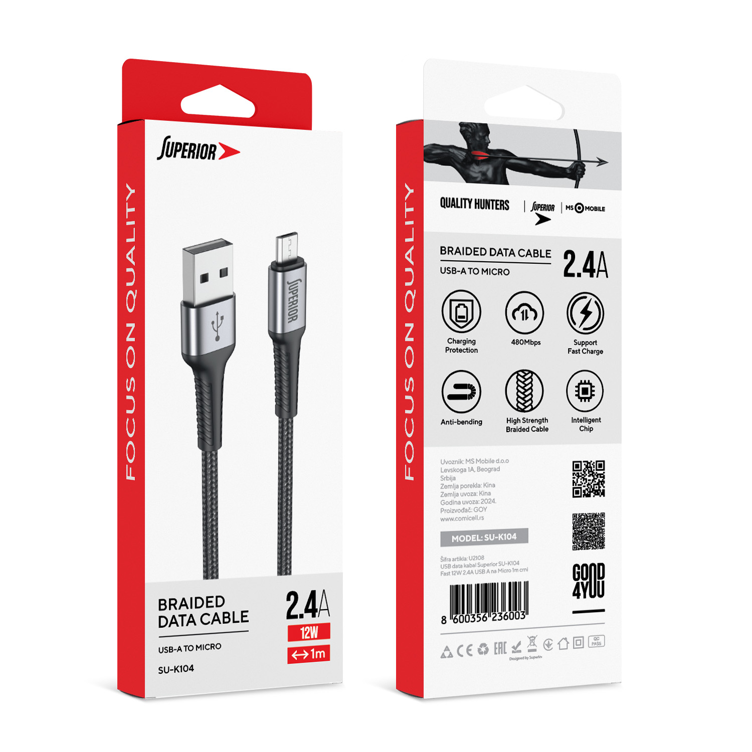 USB data kabal Superior SU-K104 pleteni Fast 12W 2.4A USB A na Micro 1m crni